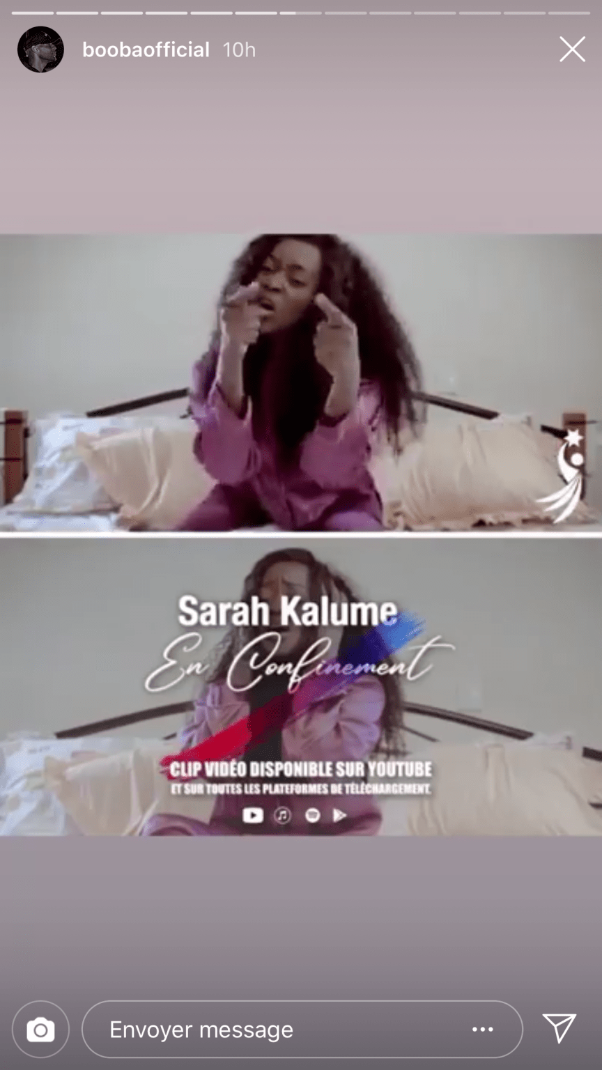 L’artiste Sarah Kalume remercie Booba avec ce message « Après avoir Liké la chanson le DUC confirme son soutien en postant le teaser de mon dernier clip « En Confinement »sur ça storie Instagram et facebook .