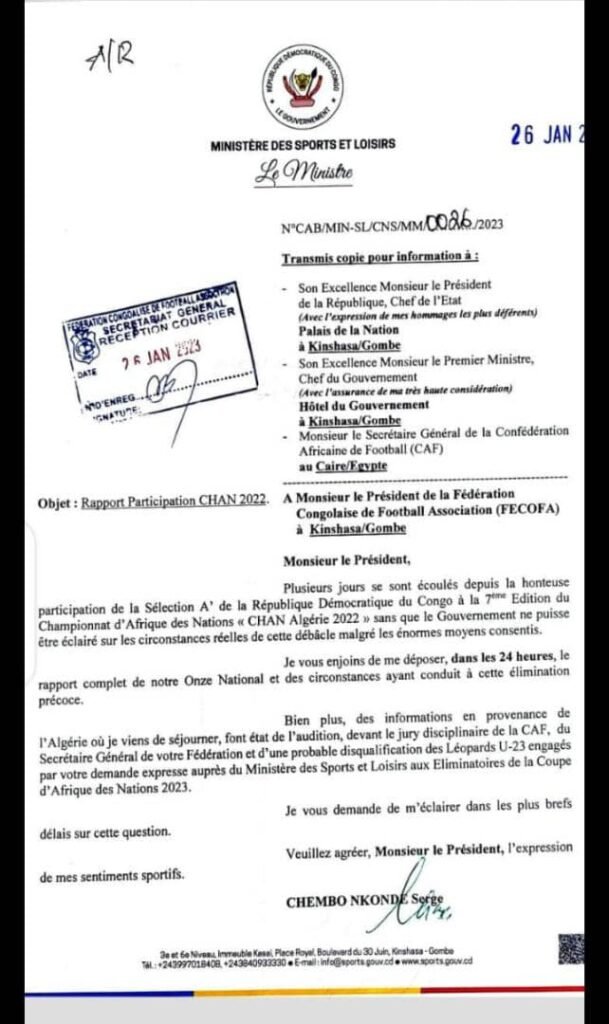 « Je vous enjoins de me déposer dans les 24 heures, le rapport complet de notre onze national et des circonstances ayant conduit à cette élimination précoce. Bien plus, des informations en provenance de l’Algérie où je viens de séjourner, font état de l’audition, devant le jury disciplinaire de la CAF, du Secrétaire Général de votre Fédération et d’une probable disqualification des léopards U-23 engagés par votre demande expresse auprès du ministère des sports et loisirs aux éliminatoires de la coupe d’Afrique des Nations 2023. » peut-on lire sur la lettre.