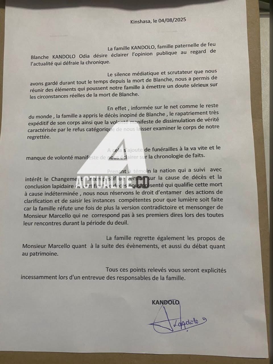 Kinshasa, 4 août 2025 – La famille Kandolo, famille paternelle de Blanche Kandolo Odia, épouse du pasteur Marcello Tunasi, a décidé de sortir de son silence. Dans une lettre officielle rendue publique, elle exprime de graves doutes sur les véritables circonstances du décès de Maman Blanche.