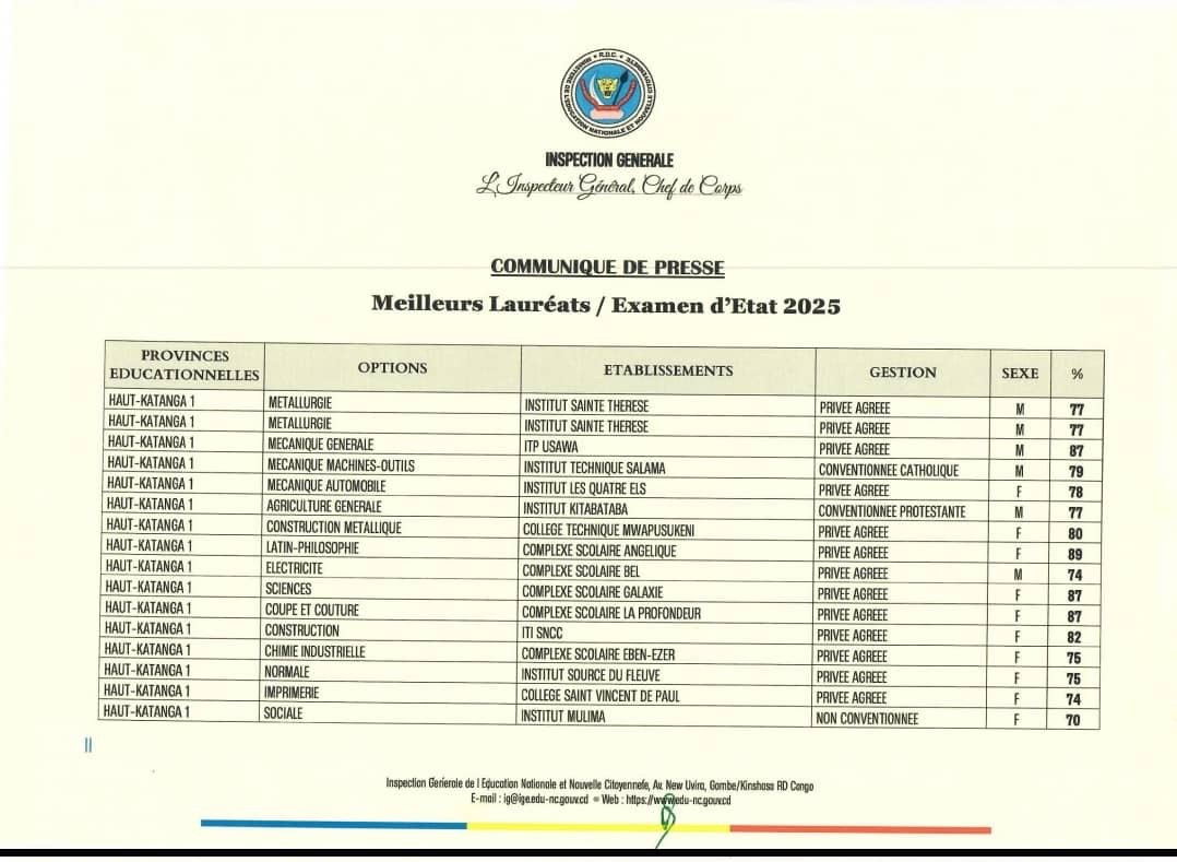 Les résultats de l’Examen d’État (Exetat 2025) sont enfin là, et la liste des meilleurs lauréats pour les provinces éducationnelles Kasaï Oriental 1, Haut-Katanga 1 et Kinshasa Mont-Amba vient d’être publiée.