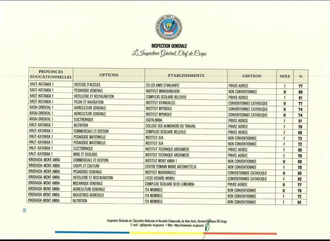Pour voir la liste complète et officielle, rendez-vous sur le site de l’Inspection Générale de l’EPST : www.eduque.gouv.cd