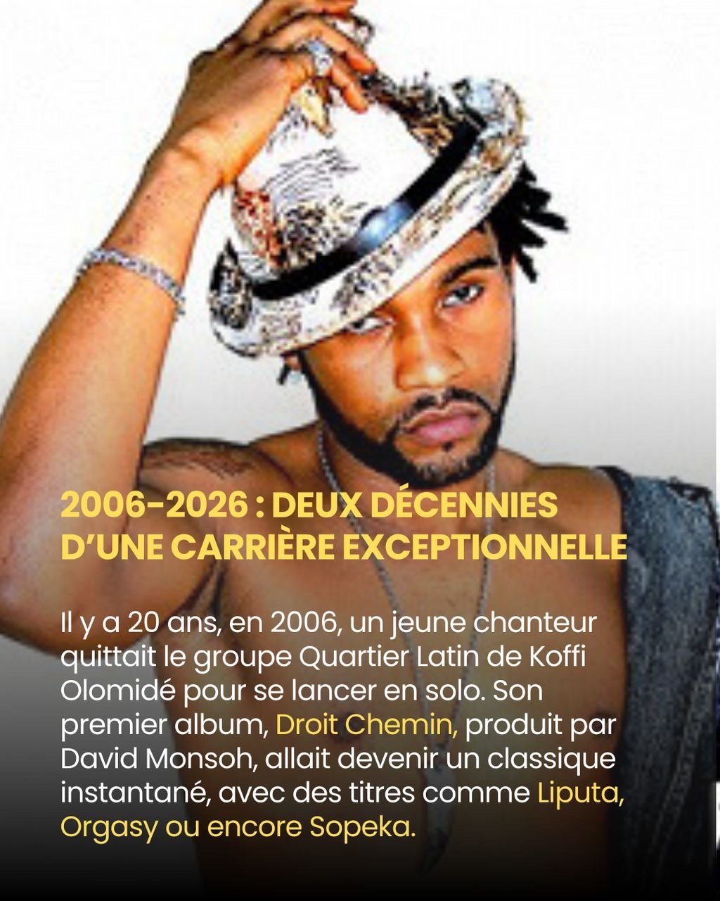 En 2006, Fally Ipupa, alors jeune chanteur du légendaire Quartier Latin de Koffi Olomidé, osait voler de ses propres ailes. Son premier album solo, Droit Chemin, produit par David Monsoh, devenait instantanément un phénomène. Des titres comme Liputa, Orgasy ou Sopeka ont marqué un tournant dans la musique congolaise, mêlant rumba sensuelle, ndombolo énergique et textes poétiques.