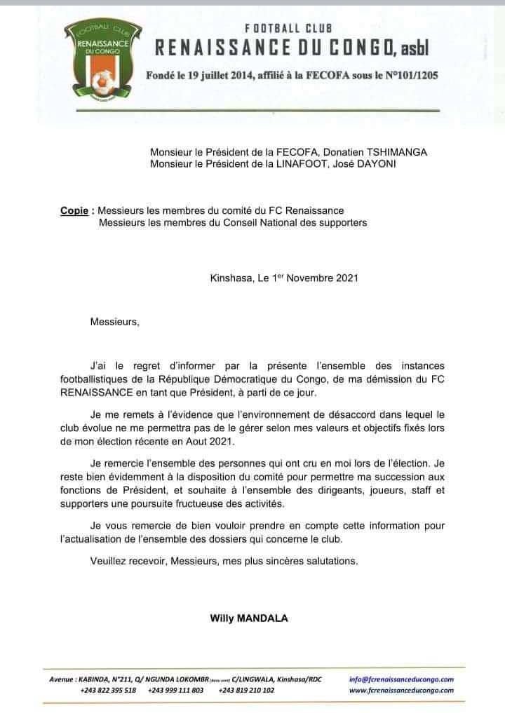 » J’ai le regret d’informer par la présente l’ensemble des instances footballistiques de la République Démocratique du Congo, de ma démission du FC RENAISSANCE en tant que Président, à parti de ce jour. Je me remets à l’évidence que l’environnement de désaccord dans lequel le club évolue ne me permettra pas de le gérer selon mes valeurs et objectifs fixés lors de mon élection récente en Aout 2021. » a-t-il écrit.