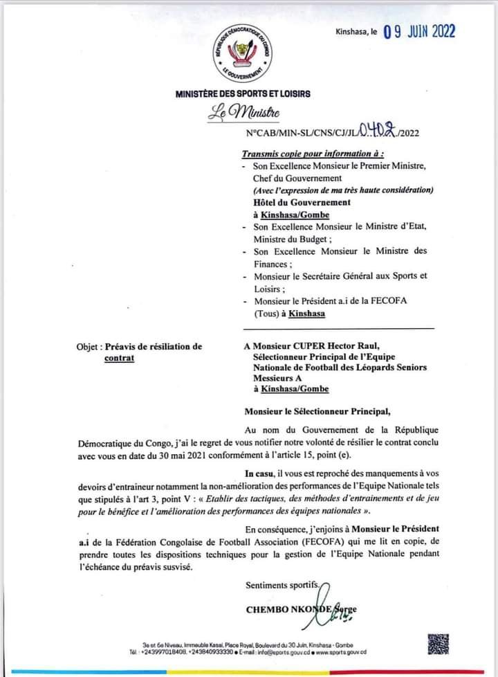 « Au nom du gouvernement de la République Démocratique du Congo, j’ai le regret de vous notifier notre volonté de résilier le contrat conclu avec vous en date du 30 mai 2021conformément à l’article […]il vous est reproché de manquement grave à vos devoirs d’entraîneur notamment la non amélioration des performances de l’équipe nationale tel que stipule l’article 3… »