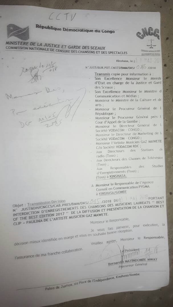 Le procureur général de la république a signé un arrêté ce vendredi 11 mai 2018, portant sur l’interdiction de la diffusion de l’audio et la vidéo de la chanson « Paulina » de l’artiste Gaz Mawete sur l’étendue nationale : Télévision, Radio, Boîte de nuit, terrasse, etc et le frappe d’une amende allant de CDF 50.000 à CDF 5.000.000.