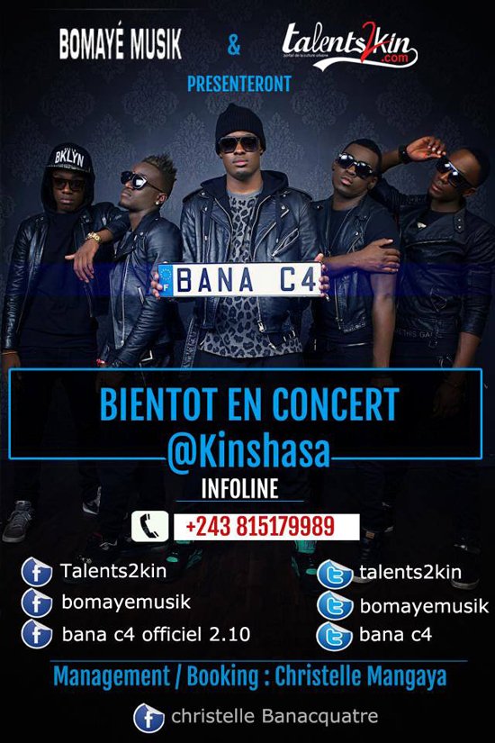 Restez branch?s sur www.talents2kin.com & sur notre page facebook http://facebook.com/talents2kin pour plus de d?tails concernant la date et le lieu du concert de Bana C4 ? Kinshasa.