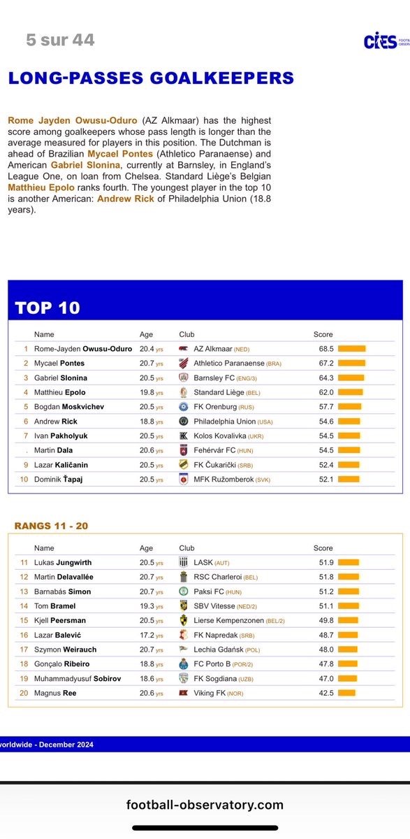 Le CIES Football Observatory, référence mondiale en analyse footballistique, place Epolo au 4e rang des gardiens U21 dans sa catégorie spécifique du jeu long, derrière des pépites comme Guillaume Restes (Toulouse). « Standard Liège’s Belgian Matthieu Epolo ranks fourth », note le rapport, soulignant sa capacité à transformer la défense en arme offensive. Avec une valeur marchande estimée à 4 millions d’euros, il attire déjà les regards, comme Toulouse qui lorgnait sur lui en septembre.