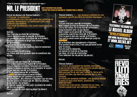 Thomas Sankara : ??Il y?en a qui poss?dent les bombes atomiques, et qui ont des probl?mes avec d?autres peuples qui eux ne poss?dent pas la bombe atomique. Mais pourquoi ils ne vont pas l?utiliser ?… Parce qu?ils savent tr?s bien, que dans ces peuples que tu oses attaquer, se trouve une jeunesse mobilis?e , une jeunesse d?cid?e ? mourir. Et nous vous disons, jeunesse de RDC, MOBILISEZ-VOUS ! L?ennemi est ? nos portes, l?ennemi est sur nous? et l?ennemi passera par des m?thodes violentes? ?