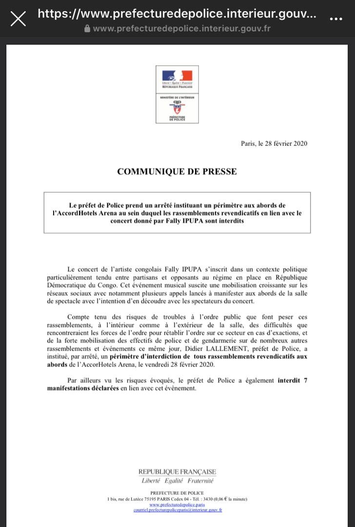 « Le préfet de Police prend un arrêté instituant un périmètre aux abords de L’AccordHotels Arena au sein duquel les rassemblements revendicatifs en lien avec le concert donné par Fally IPUPA sont interdits ».