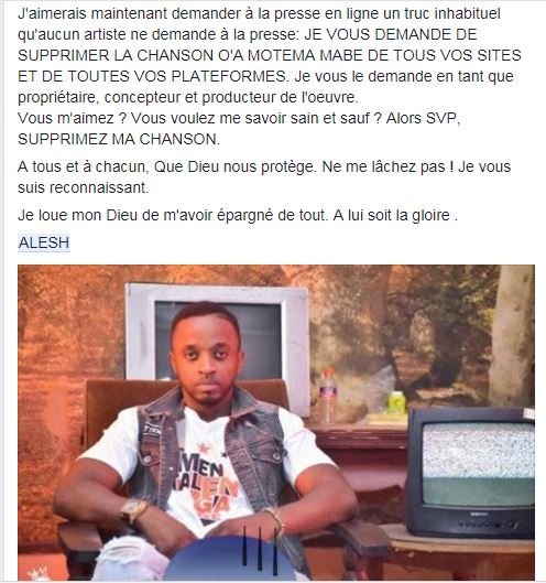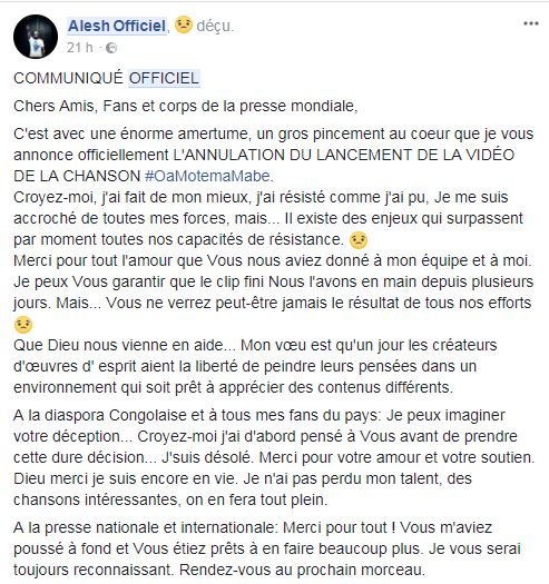 mytalents2kin, on attendait désormais de découvrir la mise en image du titre polémique « O’a Motema Mabe », excellent morceau présent sur toutes les plates-formes de téléchargement du pays ainsi que sur les stations radios. Les fans et les médias l’attendaient ce 15 Décembre 2017, date prévue pour la sortie du clip. Hier en fin de journée, Alesh a annoncé que le clip de « O’a Motema Mabe » ne sera plus publié via ses comptes Facebook :