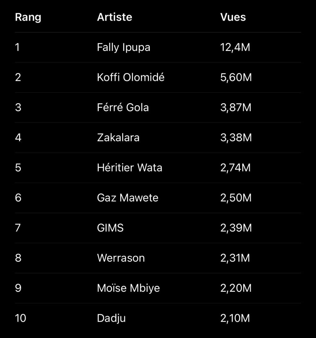 Le top 10 des artistes les plus vus en RDC :